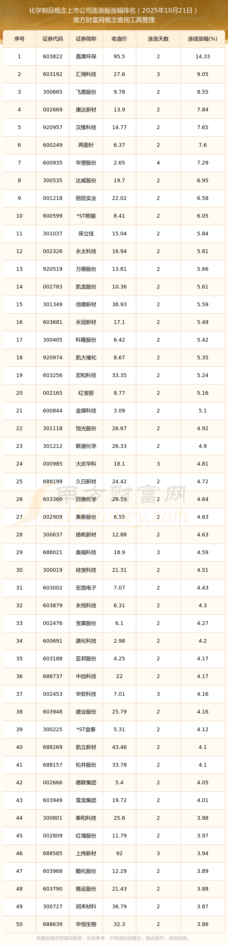 2025年10月21日化學(xué)制品概念上市公司連漲股漲幅排名