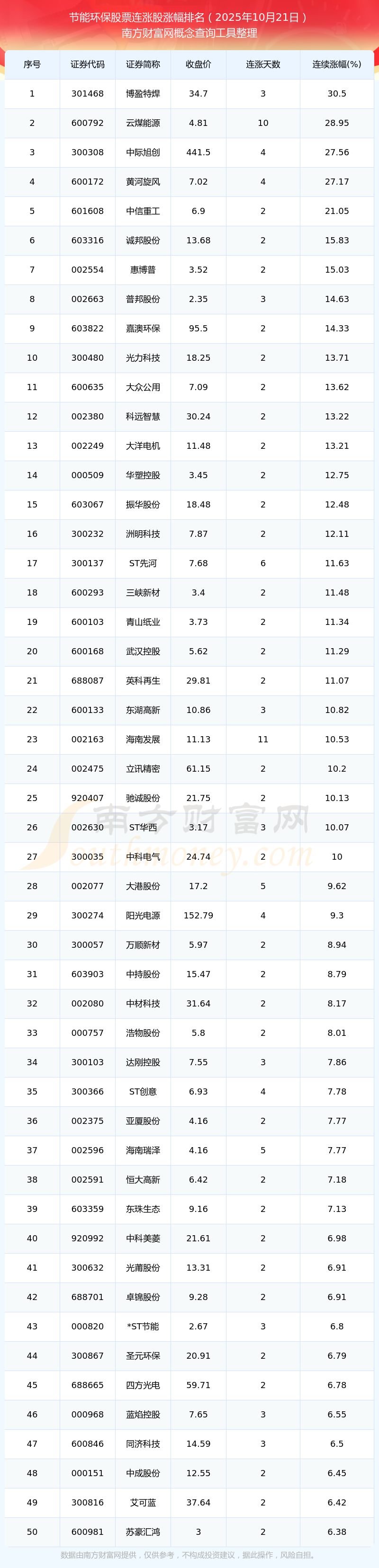 2025年10月21日節(jié)能環(huán)保股票連漲股漲幅排名