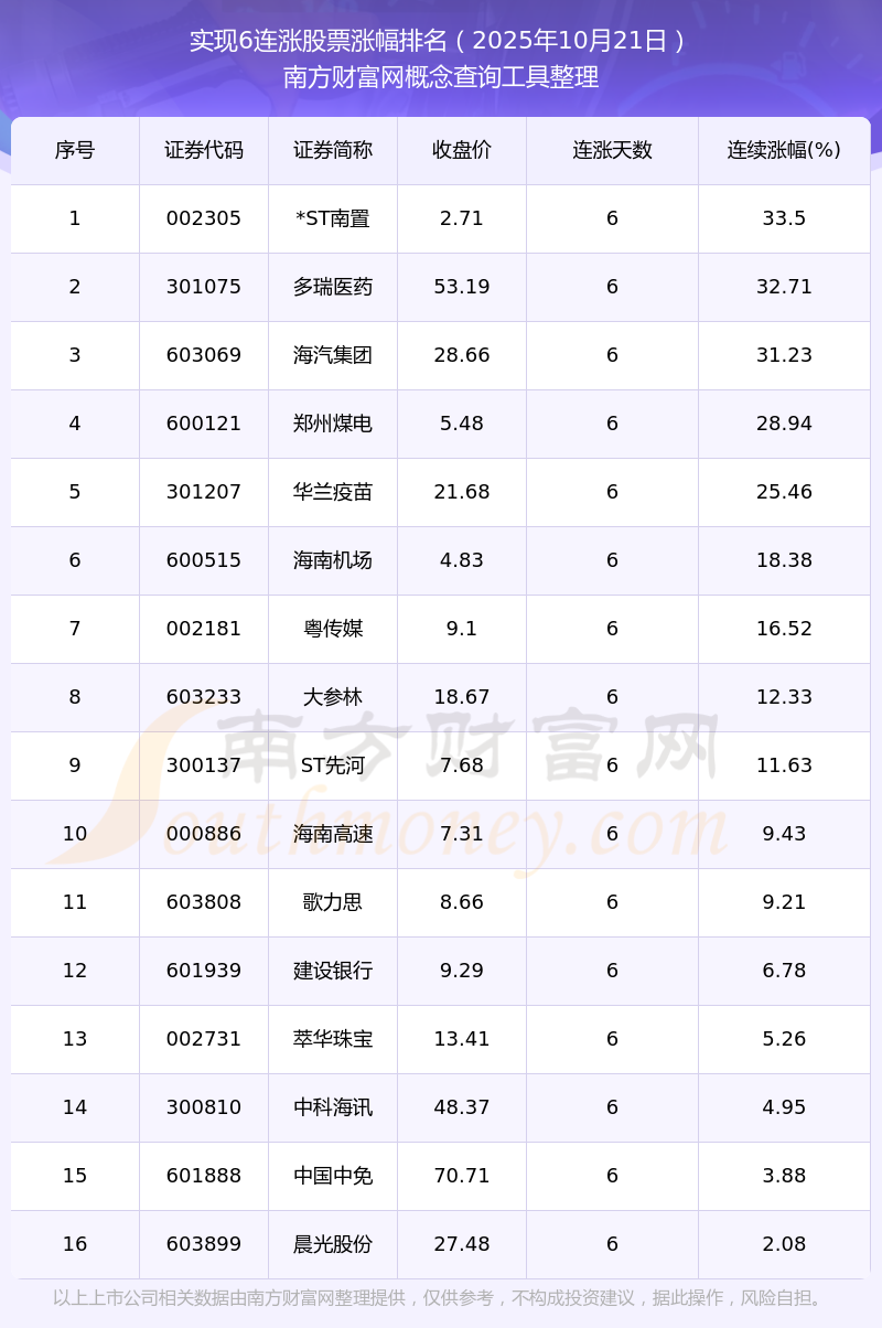 【今日股市】2025年10月21日16只股票實(shí)現(xiàn)6連漲!
