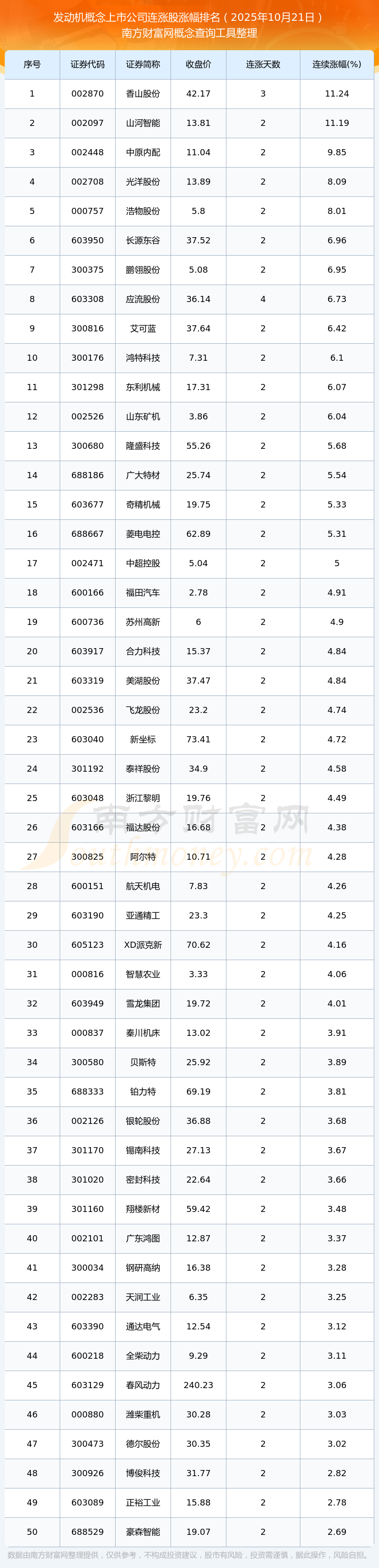 2025年10月21日發(fā)動機概念上市公司連漲股漲幅排名
