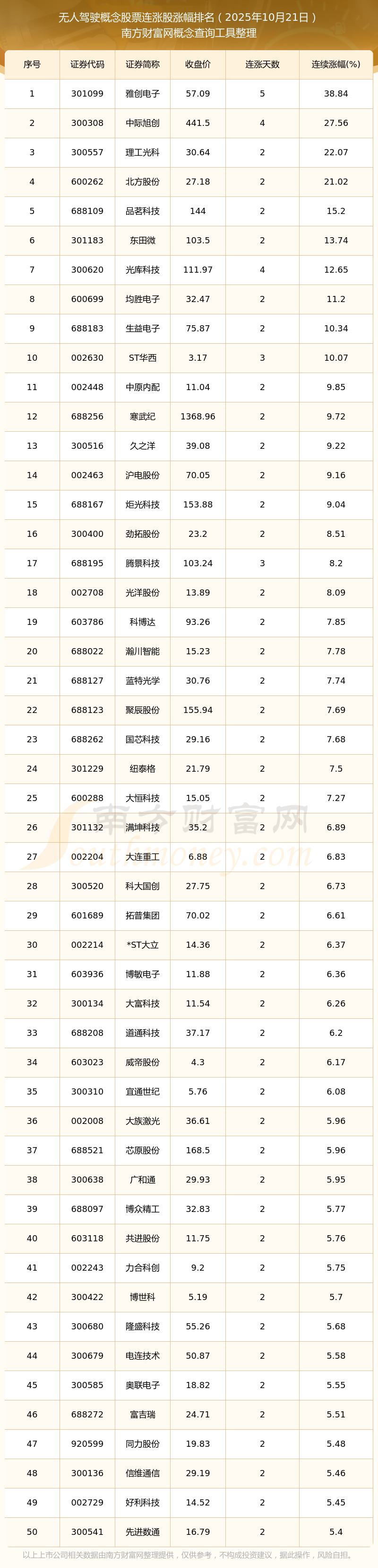 2025年10月21日無人駕駛概念股票連漲股漲幅排名
