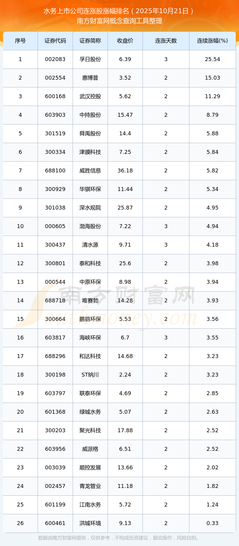 根據(jù)南方財富網(wǎng)概念查詢工具數(shù)據(jù)統(tǒng)計,截止2025年10月21日收盤,水務上市公司共有26只個股實現(xiàn)連漲。其中連續(xù)漲幅較大的個股有孚日股份、惠博普、武漢控股等,連續(xù)漲幅分別為25.54%、15.03%、11.29%。