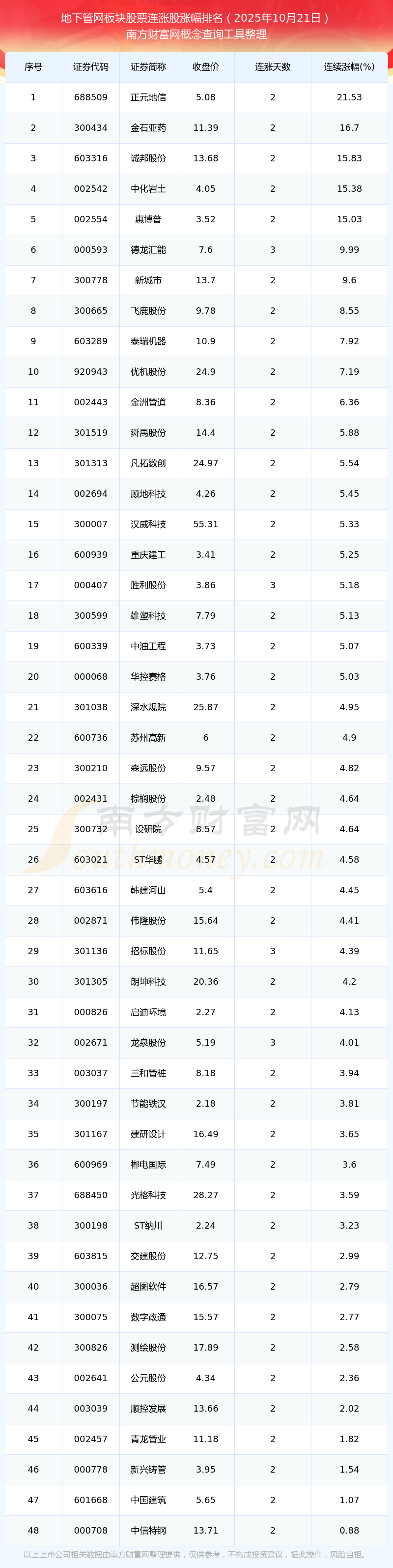 2025年10月21日地下管網(wǎng)板塊股票連漲股漲幅排名