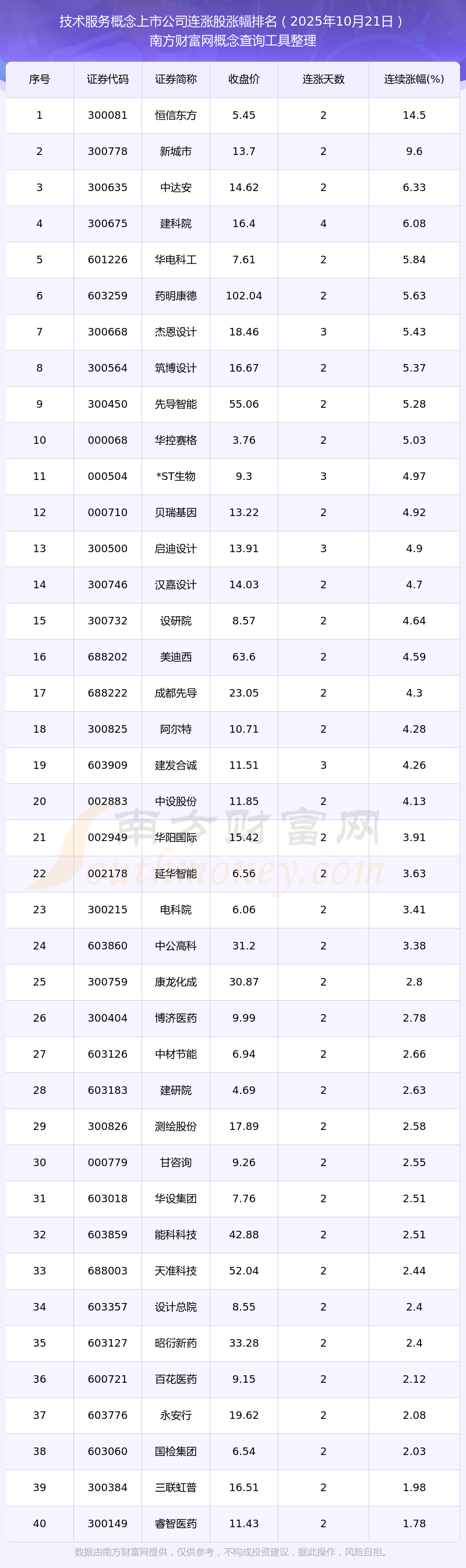 2025年10月21日技術(shù)服務(wù)概念上市公司連漲股漲幅排名