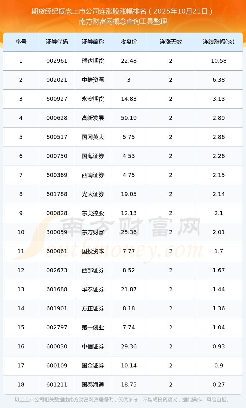 2025年10月21日期貨經(jīng)紀(jì)概念上市公司連漲股漲幅排名