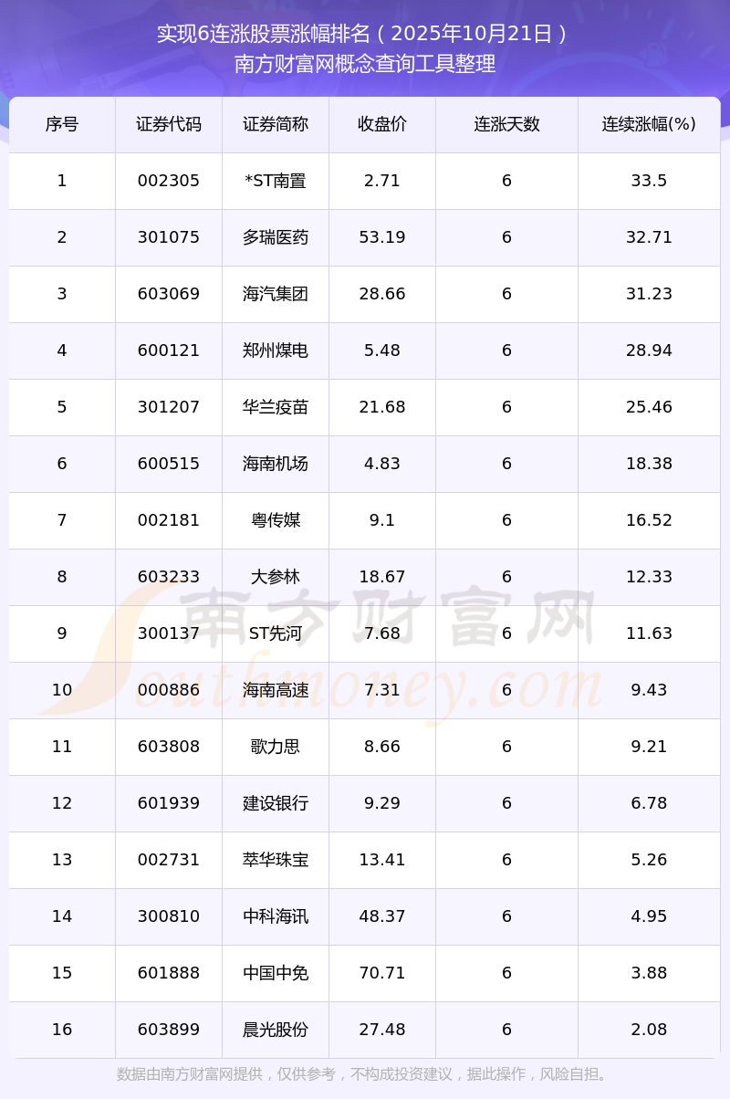 根據(jù)南方財富網(wǎng)概念查詢工具數(shù)據(jù)統(tǒng)計,截止2025年10月21日收盤,共有16只個股實現(xiàn)6天連漲。其中連續(xù)漲幅較大的個股有*ST南置、多瑞醫(yī)藥、海汽集團等,連續(xù)漲幅分別為33.50%、32.71%、31.23%。