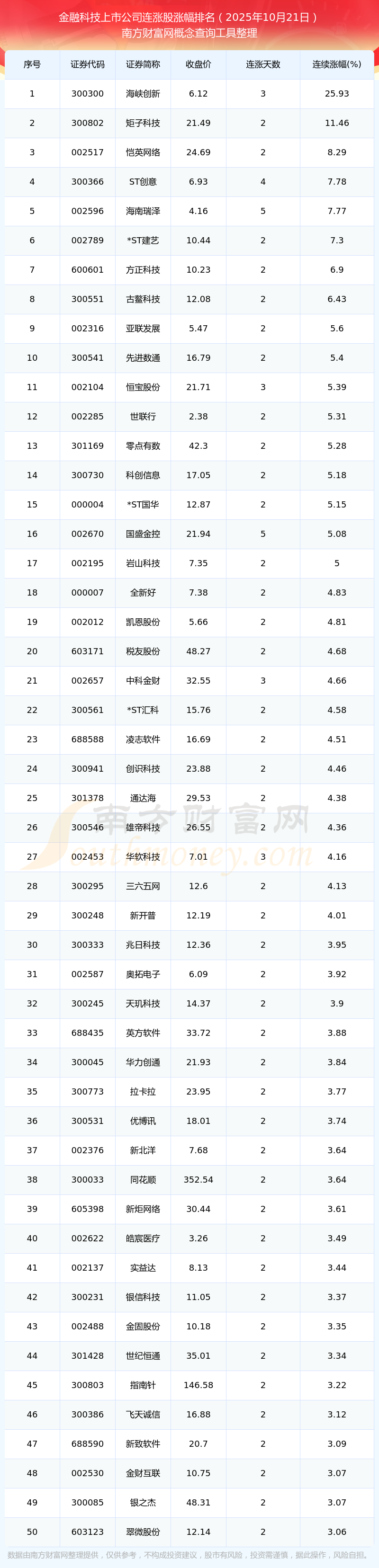 2025年10月21日金融科技上市公司連漲股漲幅排名