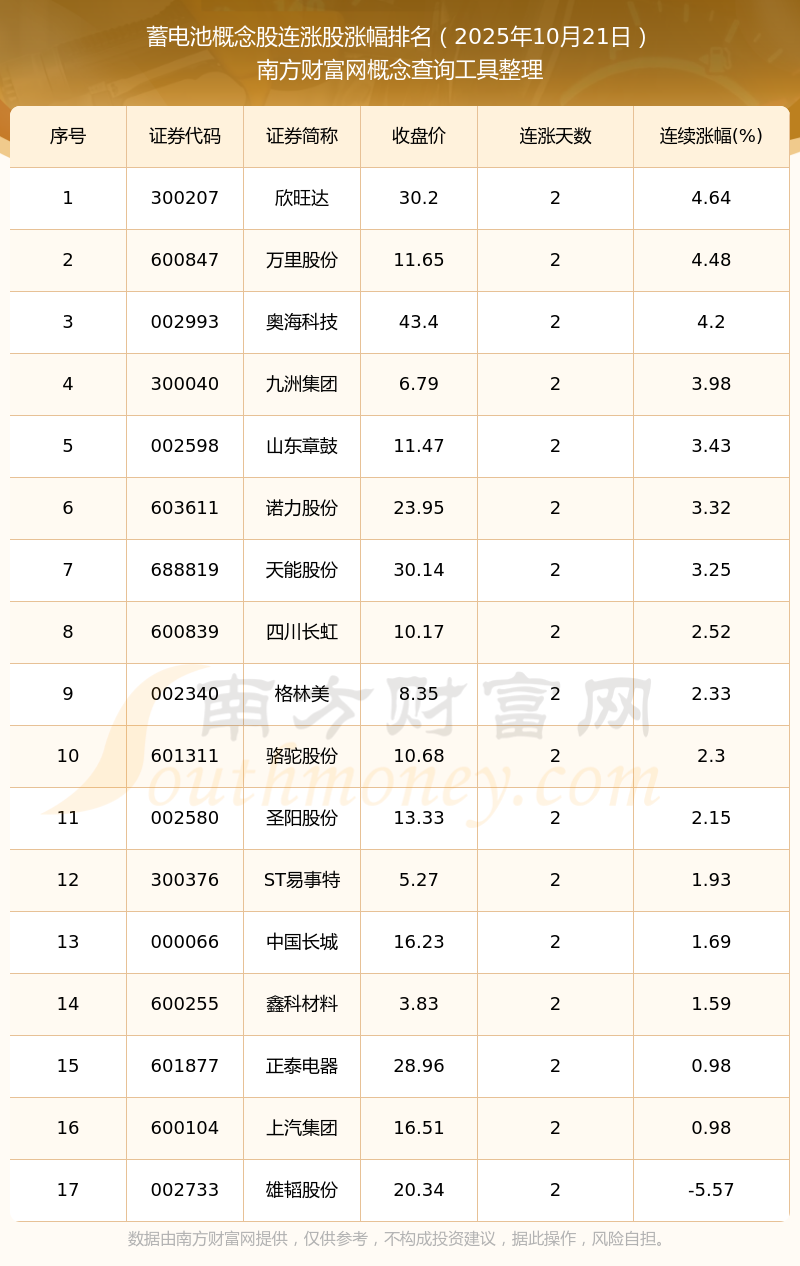 2025年10月21日蓄電池概念股連漲股漲幅排名