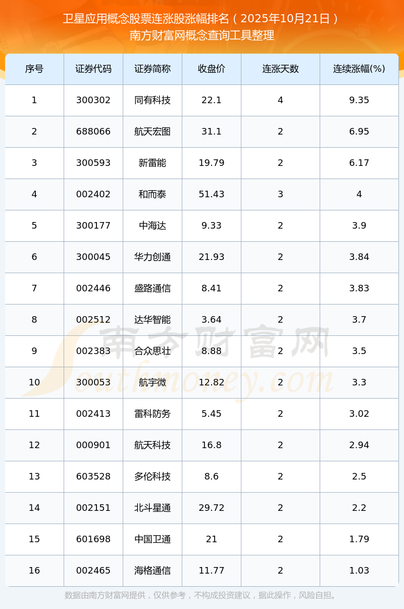 2025年10月21日衛(wèi)星應(yīng)用概念股票連漲股漲幅排名