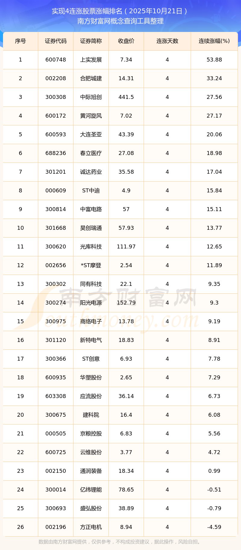 根據(jù)南方財富網(wǎng)概念查詢工具數(shù)據(jù)統(tǒng)計,截止2025年10月21日收盤,共有26只個股實現(xiàn)4天連漲。其中連續(xù)漲幅較大的個股有上實發(fā)展、合肥城建、中際旭創(chuàng)等,連續(xù)漲幅分別為53.88%、33.24%、27.56%。