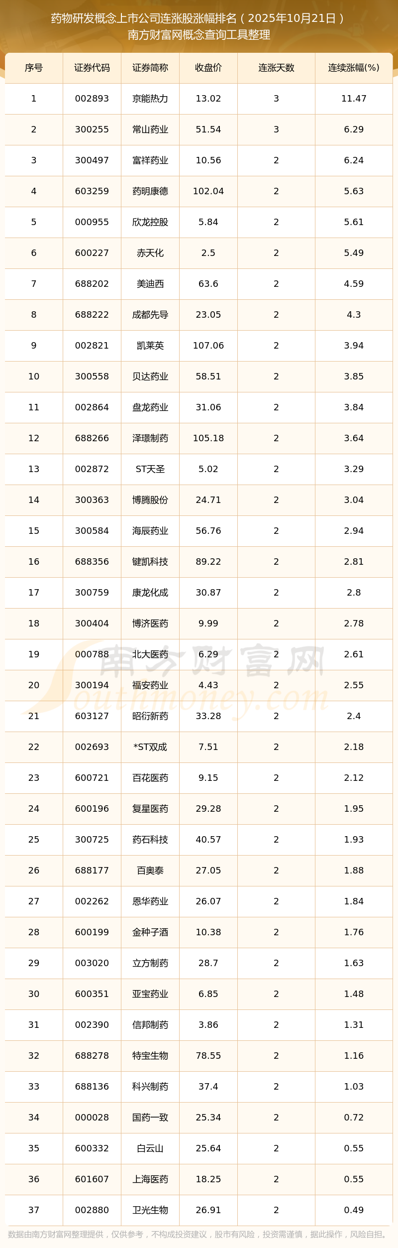 2025年10月21日藥物研發(fā)概念上市公司連漲股漲幅排名