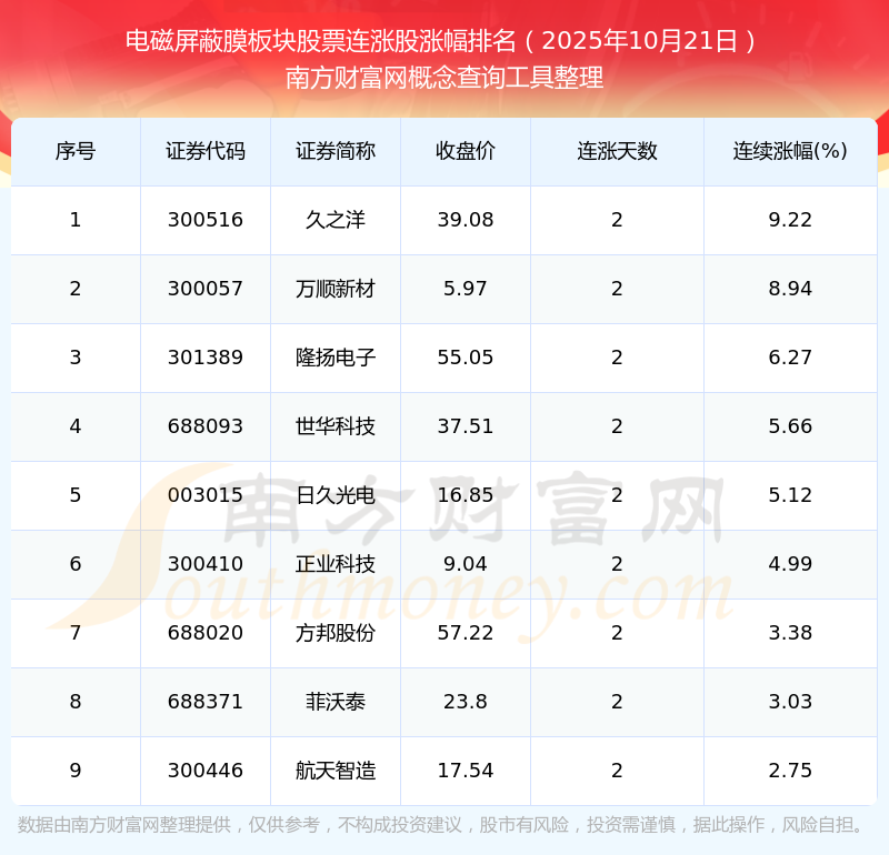 2025年10月21日電磁屏蔽膜板塊股票連漲股漲幅排名