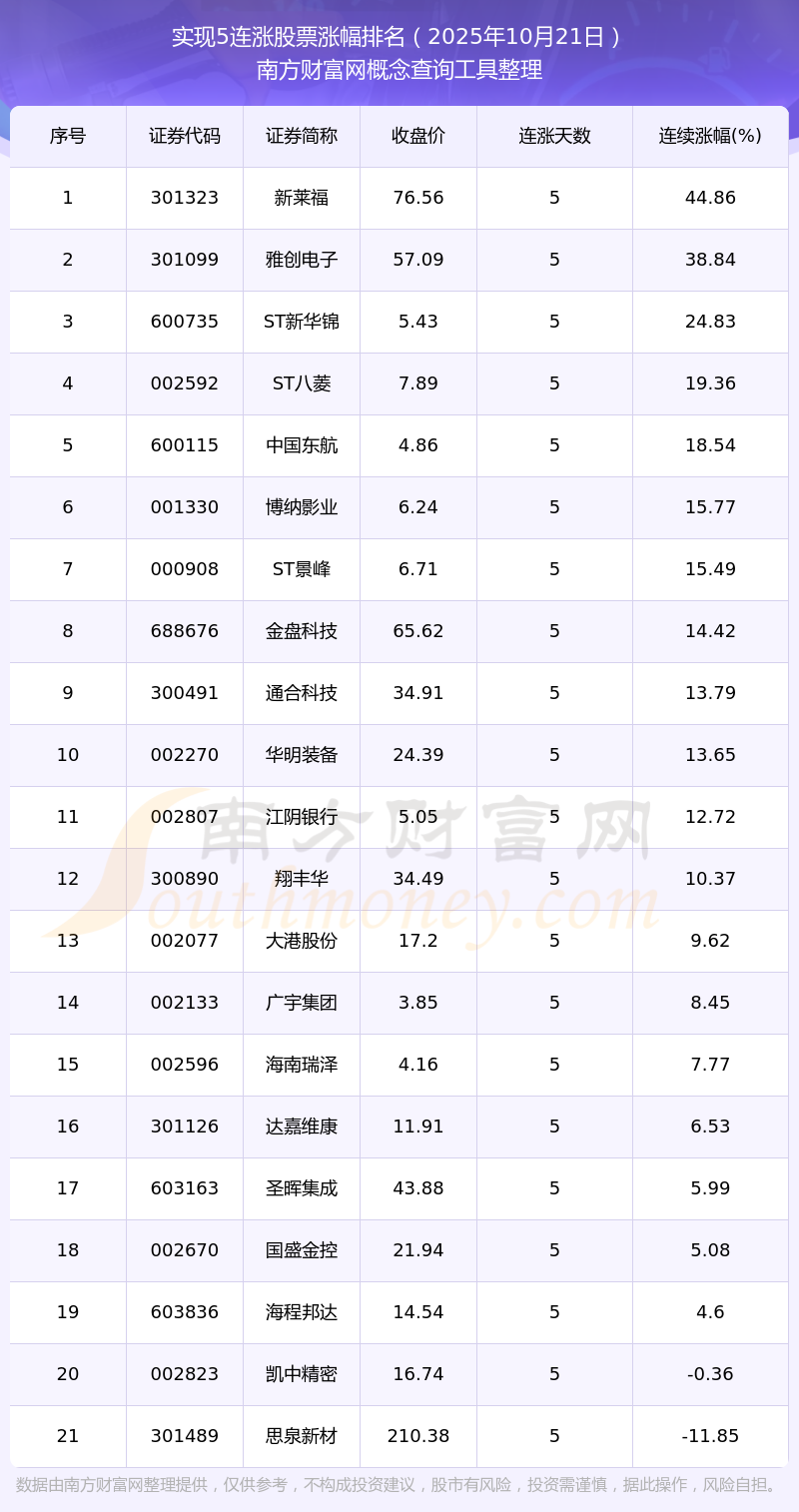 根據(jù)南方財富網(wǎng)概念查詢工具數(shù)據(jù)統(tǒng)計,截止2025年10月21日收盤,共有21只個股實現(xiàn)5天連漲。其中連續(xù)漲幅較大的個股有新萊福、雅創(chuàng)電子、ST新華錦等,連續(xù)漲幅分別為44.86%、38.84%、24.83%。