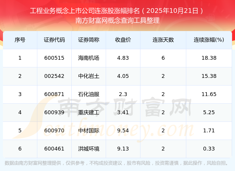 根據(jù)南方財(cái)富網(wǎng)概念查詢工具數(shù)據(jù)統(tǒng)計(jì),截止2025年10月21日收盤(pán),工程業(yè)務(wù)概念上市公司共有6只個(gè)股實(shí)現(xiàn)連漲。其中連續(xù)漲幅較大的個(gè)股有海南機(jī)場(chǎng)、中化巖土、石化油服等,連續(xù)漲幅分別為18.38%、15.38%、11.65%。