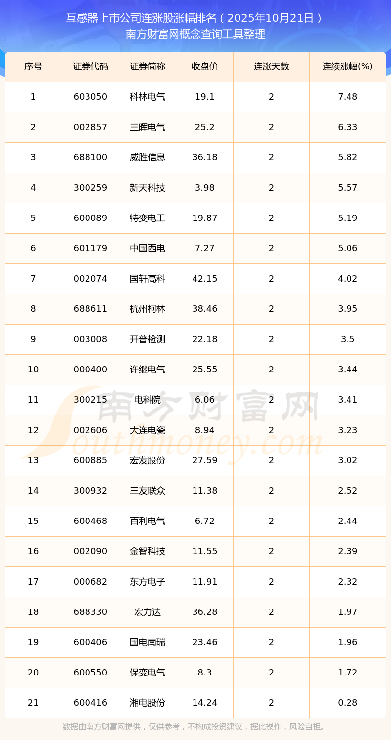 2025年10月21日互感器上市公司連漲股漲幅排名