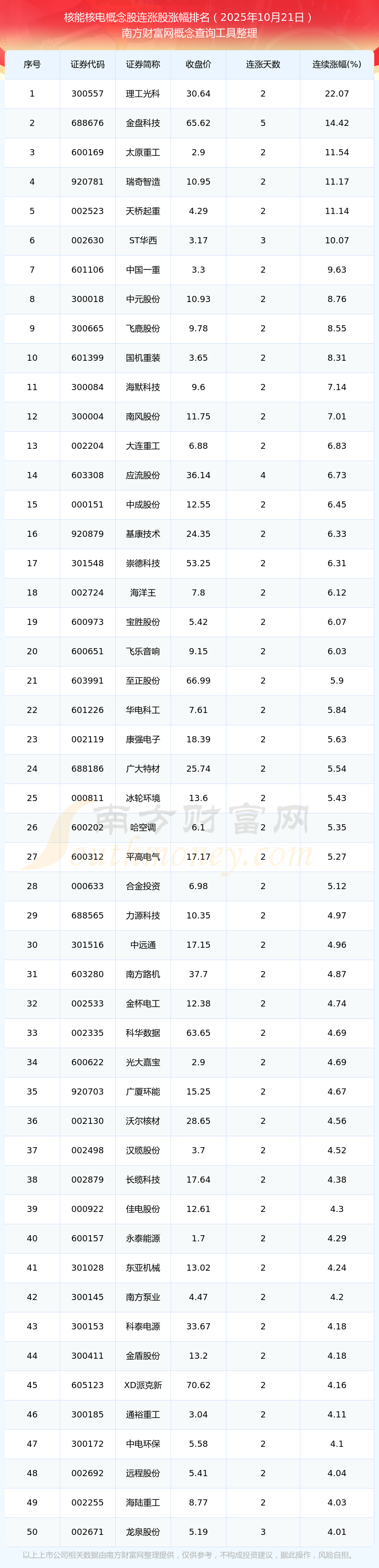 2025年10月21日核能核電概念股連漲股漲幅排名