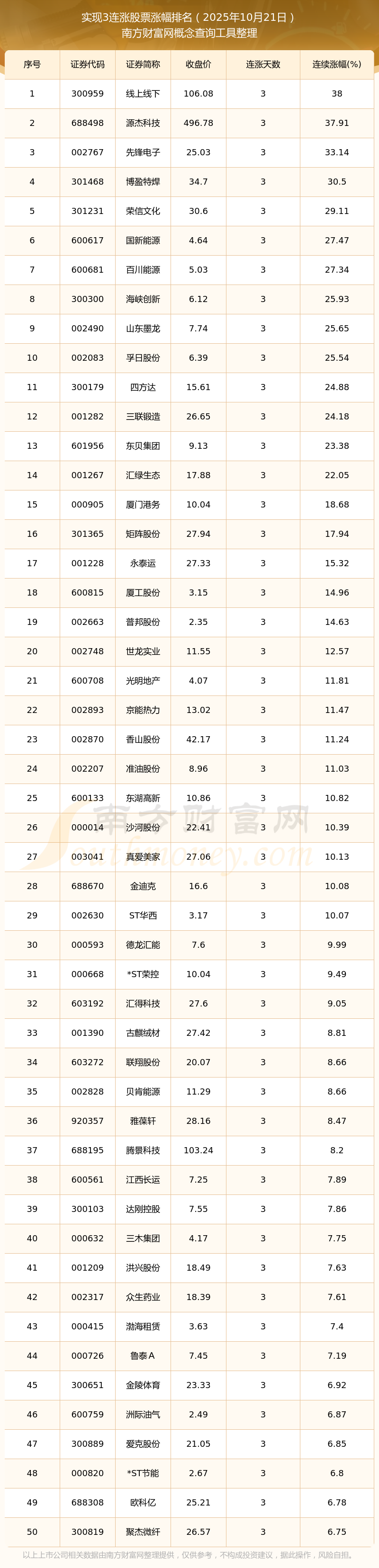 2025年10月21日實(shí)現(xiàn)3連漲股票漲幅排名