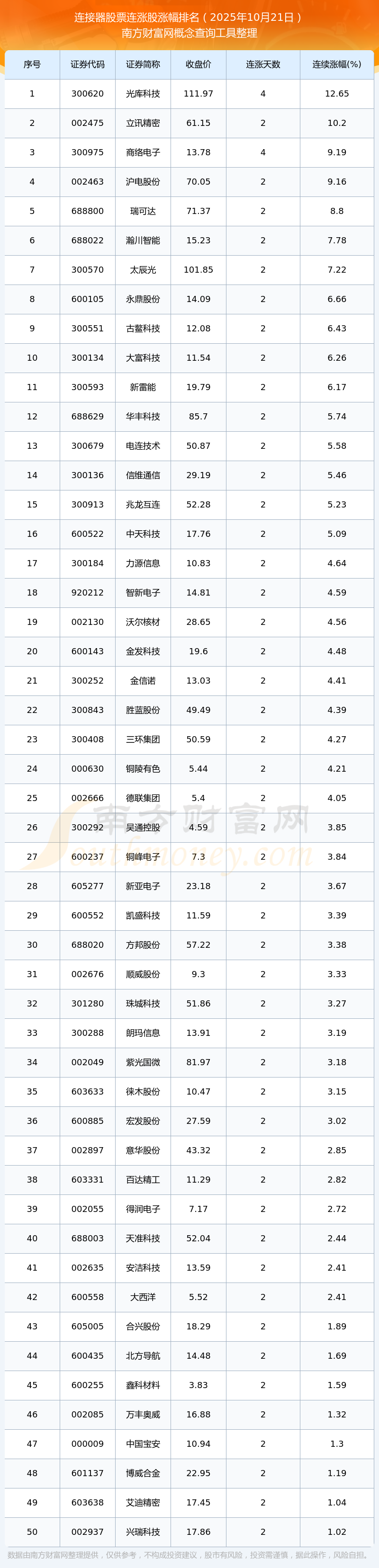 根據(jù)南方財(cái)富網(wǎng)概念查詢(xún)工具數(shù)據(jù)統(tǒng)計(jì),截止2025年10月21日收盤(pán),連接器股票共有52只個(gè)股實(shí)現(xiàn)連漲。其中連續(xù)漲幅較大的個(gè)股有光庫(kù)科技、立訊精密、商絡(luò)電子等,連續(xù)漲幅分別為12.65%、10.20%、9.19%。