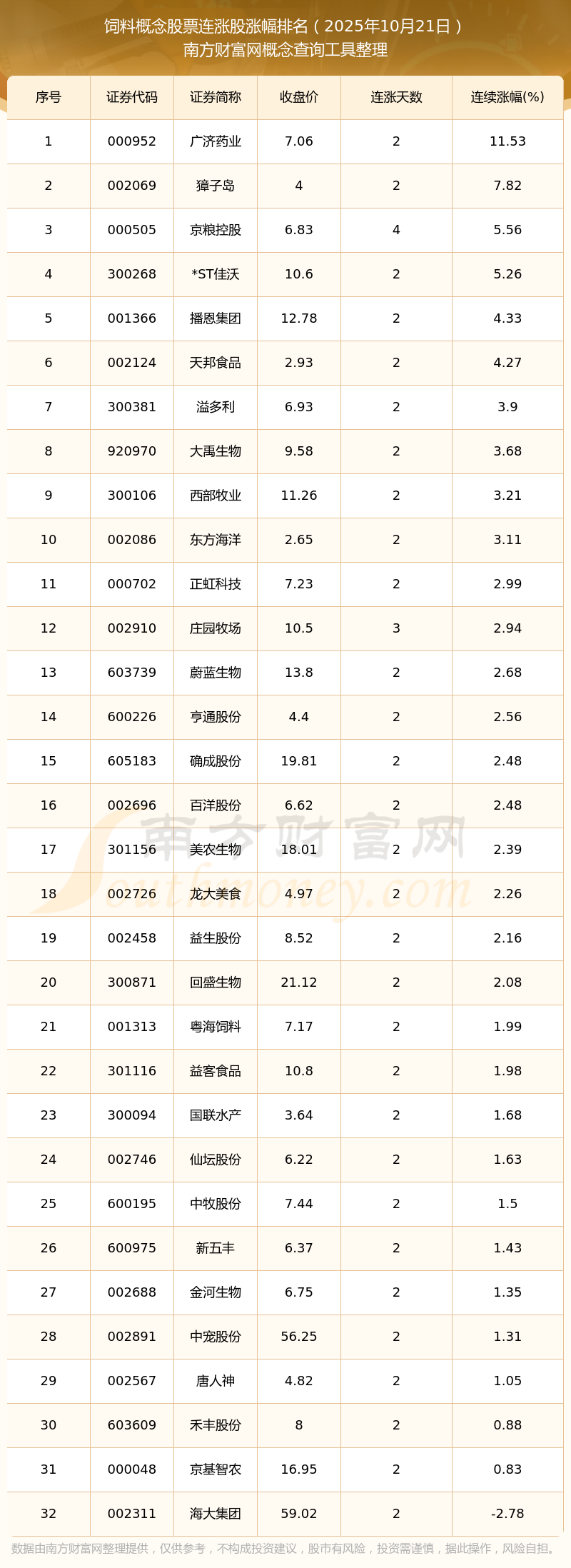 2025年10月21日飼料概念股票連漲股票漲幅排名