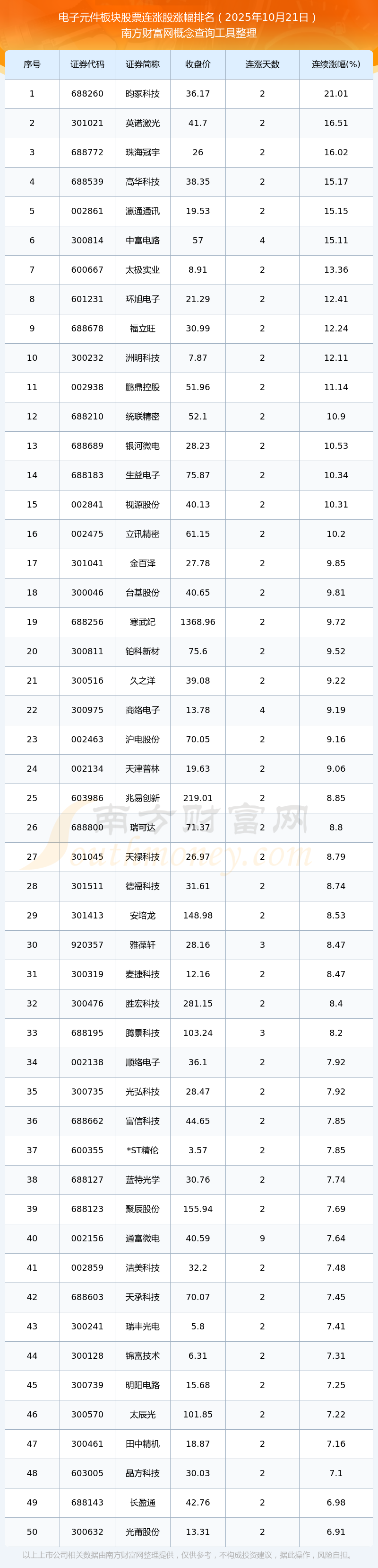2025年10月21日電子元件板塊股票連漲股漲幅排名
