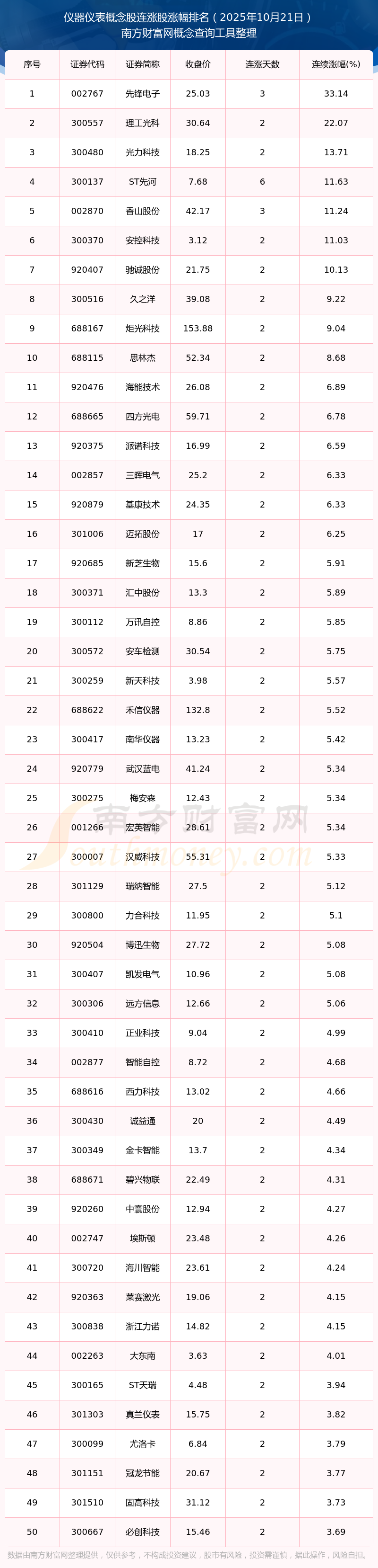 2025年10月21日儀器儀表概念股連漲股漲幅排名