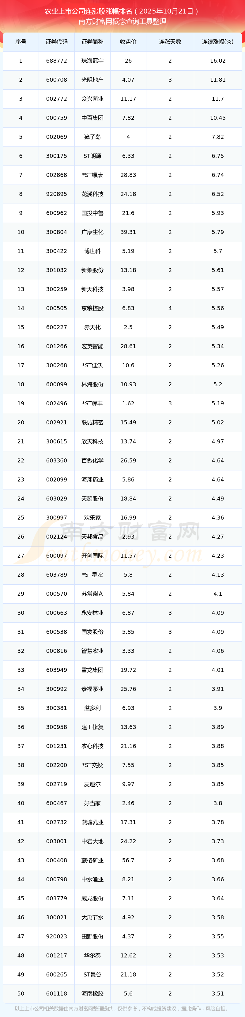 2025年10月21日農(nóng)業(yè)上市公司連漲股漲幅排名