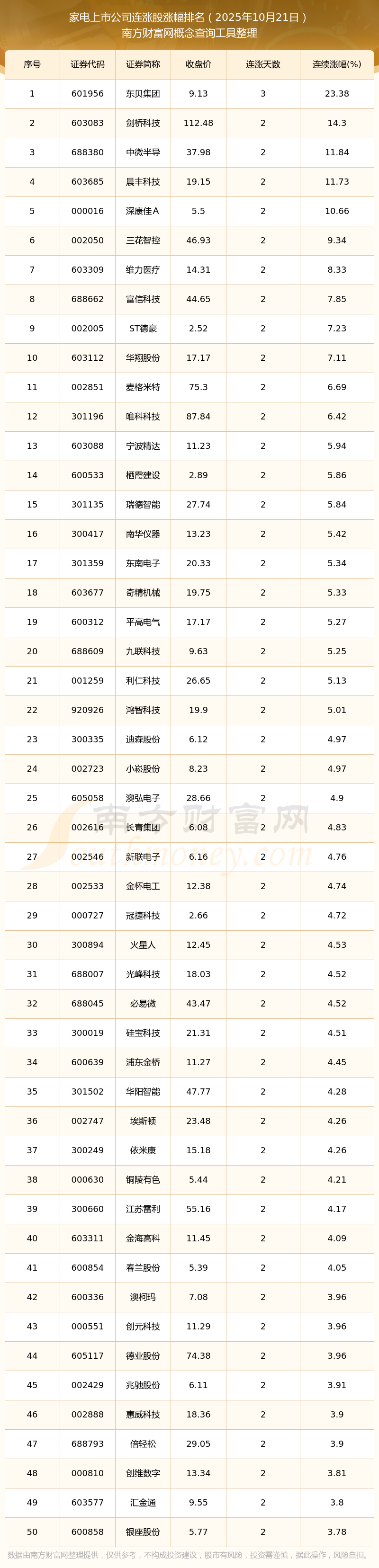 2025年10月21日家電上市公司連漲股漲幅排名