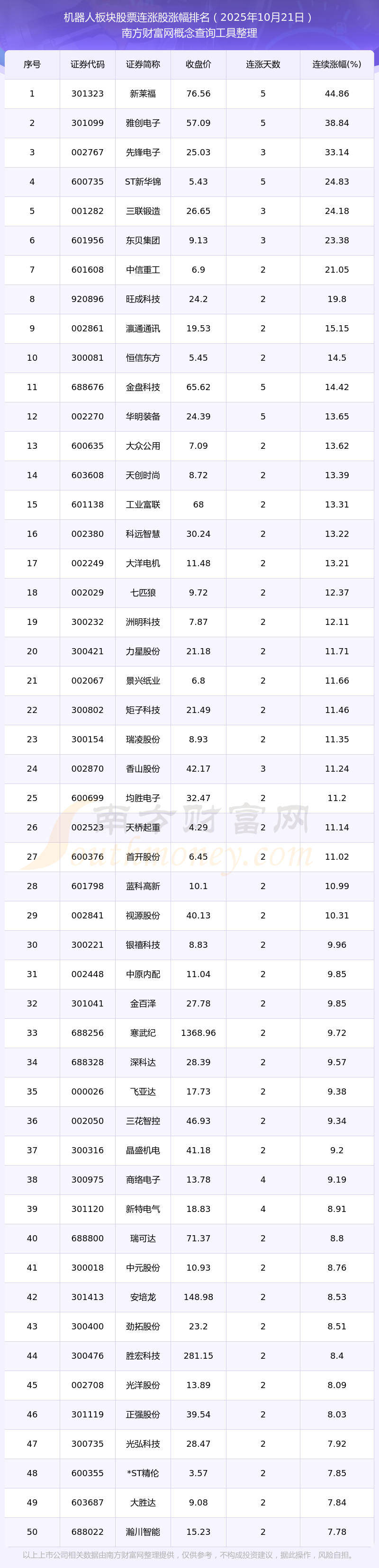 2025年10月21日機(jī)器人板塊股票連漲股票漲幅排名