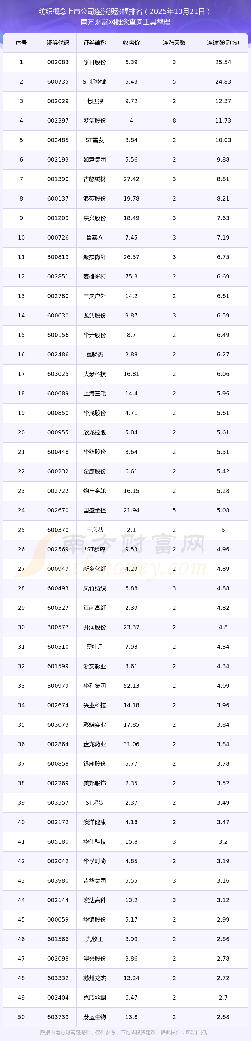 2025年10月21日紡織概念上市公司連漲股漲幅排名