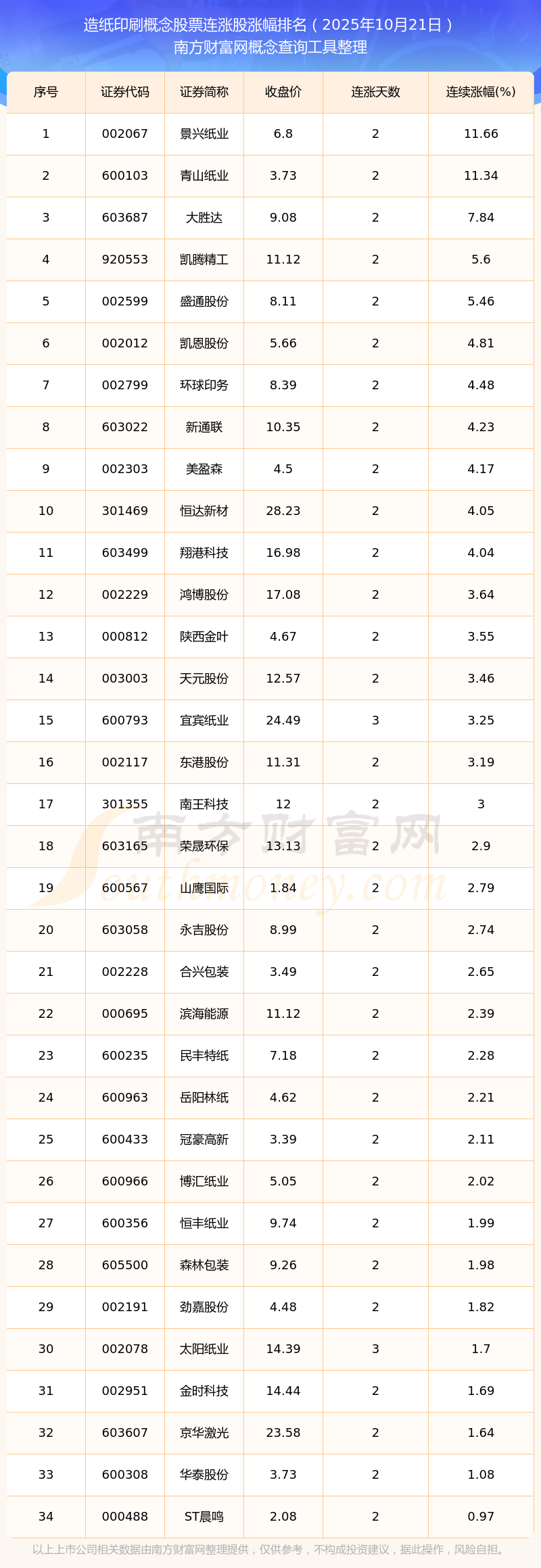 2025年10月21日造紙印刷概念股票連漲股票漲幅排名