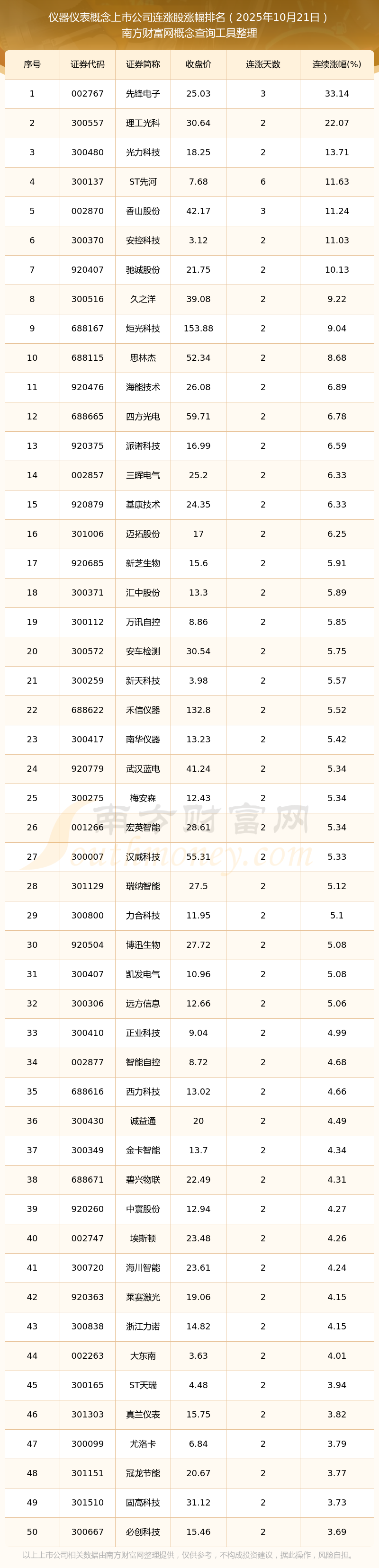 2025年10月21日儀器儀表概念上市公司連漲股漲幅排名