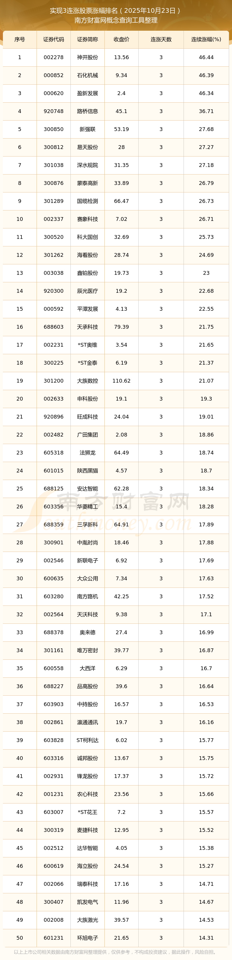 2025年10月23日實(shí)現(xiàn)3連漲股票漲幅排名