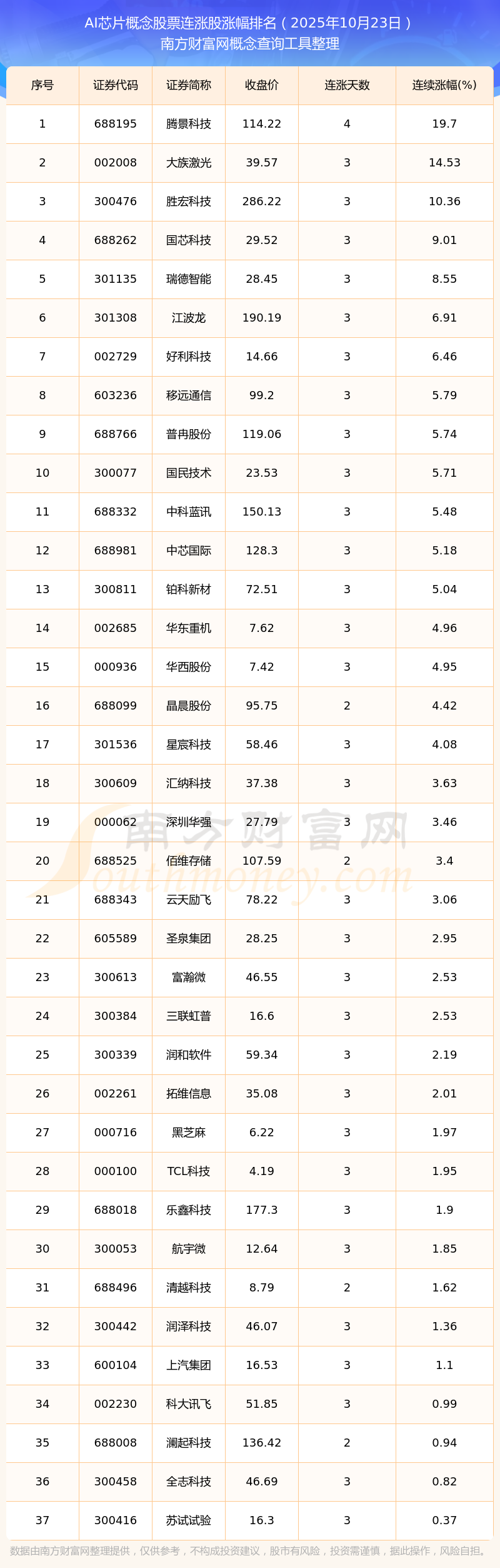 2025年10月23日AI芯片概念股票連漲股漲幅排名