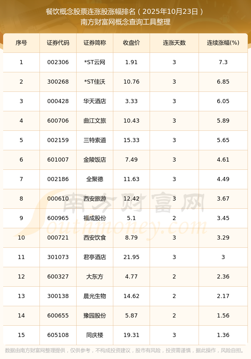 2025年10月23日餐飲概念股票連漲股漲幅排名