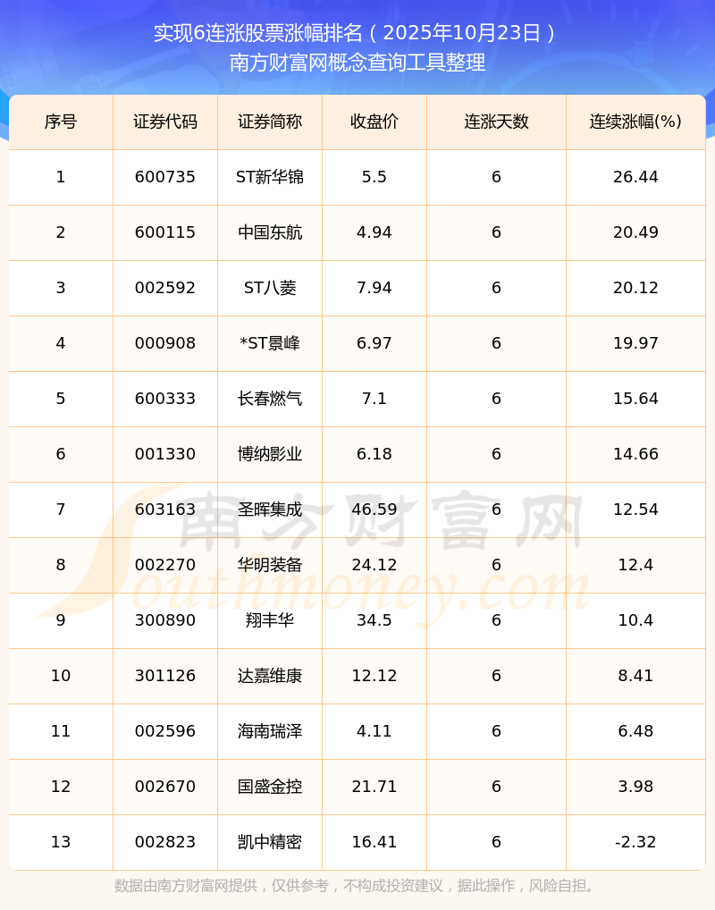 根據(jù)南方財富網(wǎng)概念查詢工具數(shù)據(jù)統(tǒng)計,截止2025年10月23日收盤,共有13只個股實現(xiàn)6天連漲。其中連續(xù)漲幅較大的個股有ST新華錦、中國東航、ST八菱等,連續(xù)漲幅分別為26.44%、20.49%、20.12%。