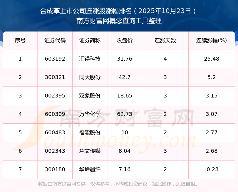 2025年10月23日合成革上市公司連漲股漲幅排名