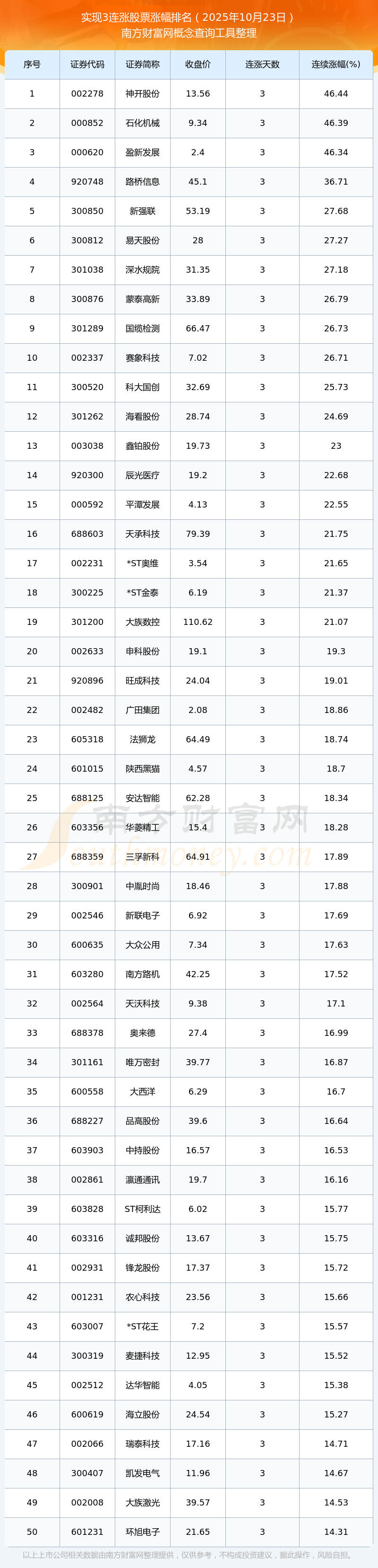 2025年10月23日實(shí)現(xiàn)3連漲股票漲幅排名