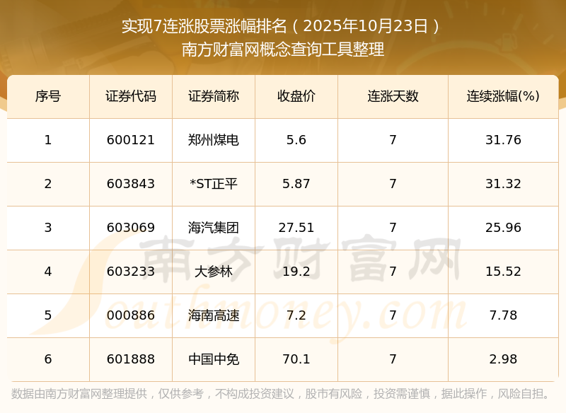根據(jù)南方財(cái)富網(wǎng)概念查詢工具數(shù)據(jù)統(tǒng)計(jì),截止2025年10月23日收盤,共有6只個(gè)股實(shí)現(xiàn)7天連漲。其中連續(xù)漲幅較大的個(gè)股有鄭州煤電、*ST正平、海汽集團(tuán)等,連續(xù)漲幅分別為31.76%、31.32%、25.96%。