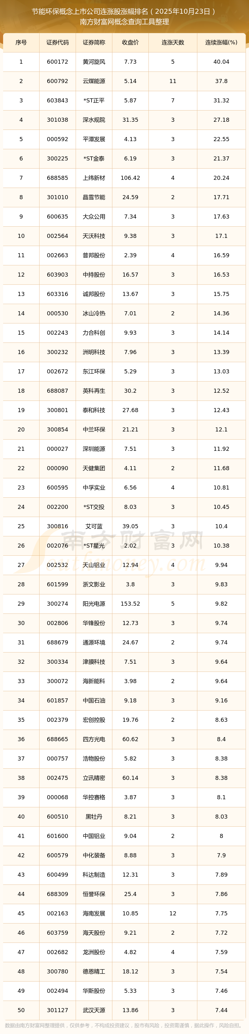 2025年10月23日節(jié)能環(huán)保概念上市公司連漲股漲幅排名