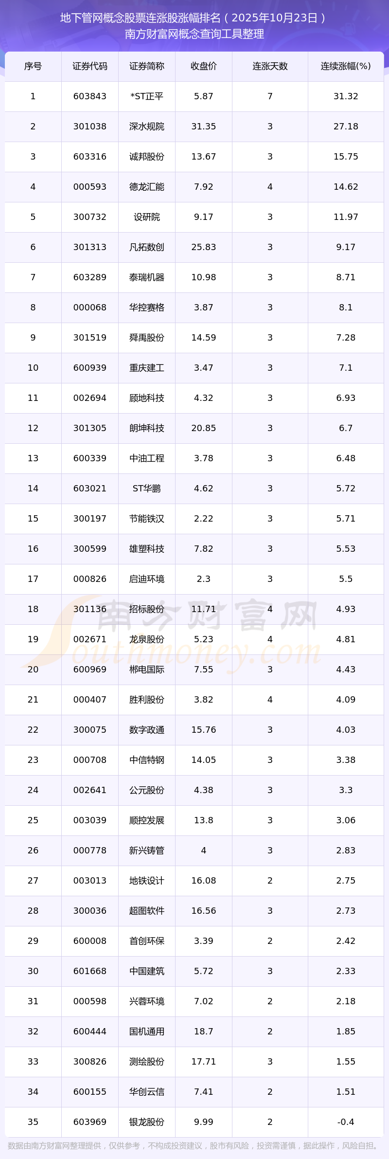 2025年10月23日地下管網(wǎng)概念股票連漲股漲幅排名
