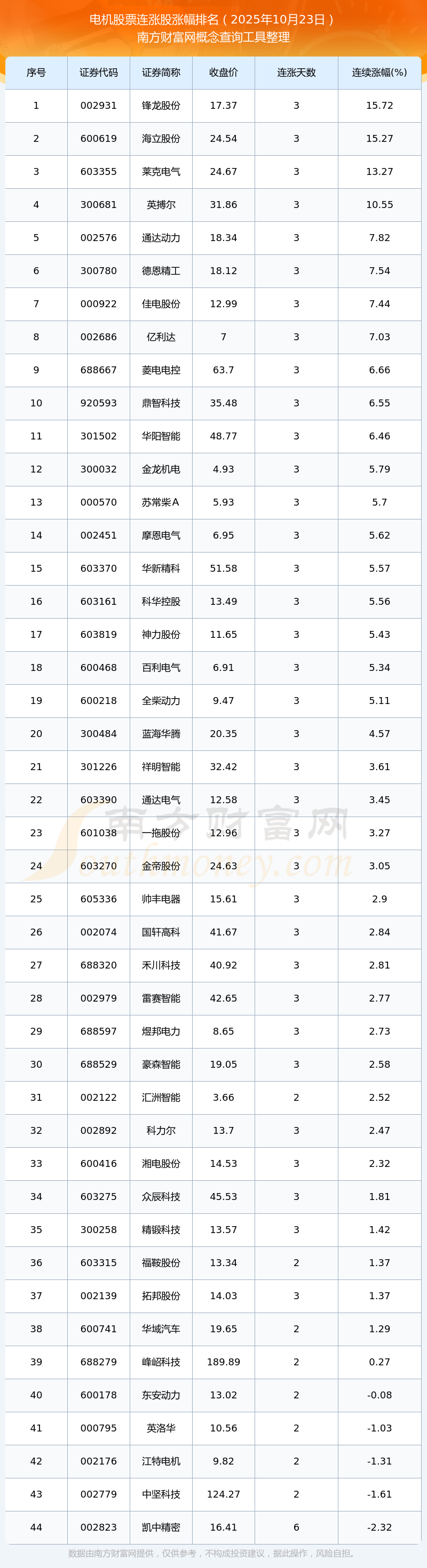 2025年10月23日電機(jī)股票連漲股票漲幅排名
