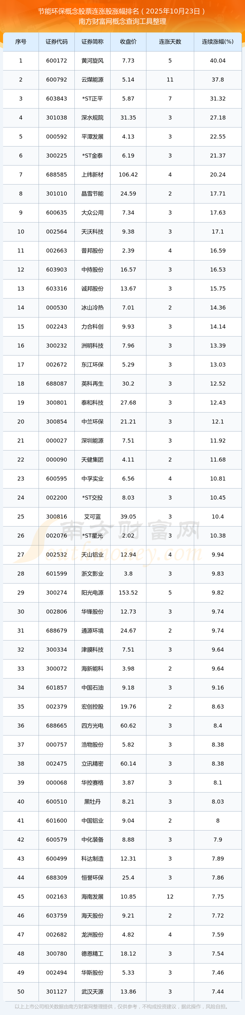 2025年10月23日節(jié)能環(huán)保概念股票連漲股漲幅排名