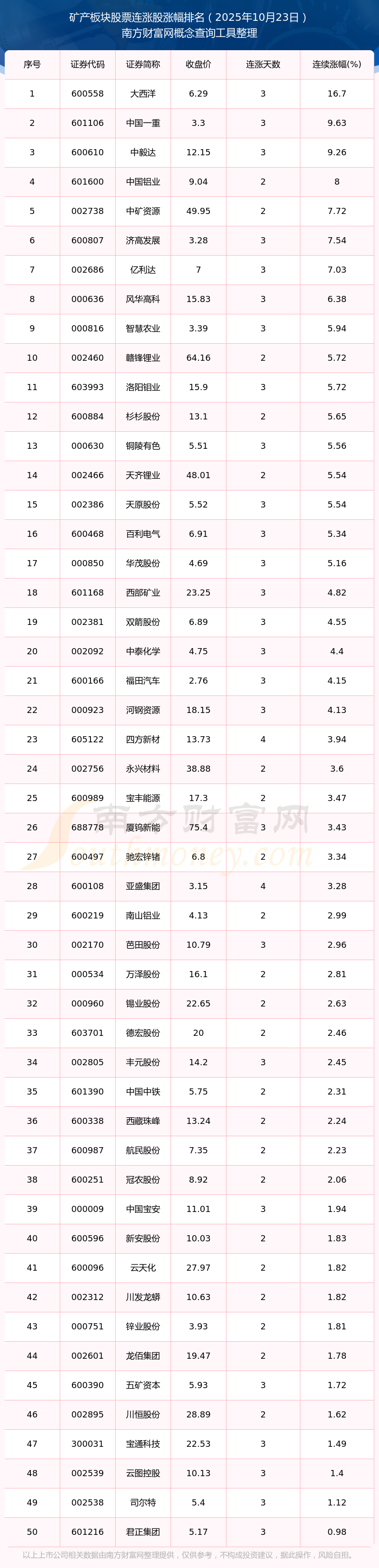 2025年10月23日礦產(chǎn)板塊股票連漲股漲幅排名