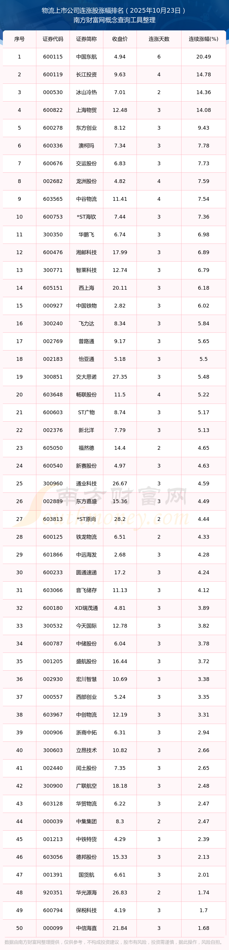 根據(jù)南方財富網概念查詢工具數(shù)據(jù)統(tǒng)計,截止2025年10月23日收盤,物流上市公司共有55只個股實現(xiàn)連漲。其中連續(xù)漲幅較大的個股有中國東航、長江投資、冰山冷熱等,連續(xù)漲幅分別為20.49%、14.78%、14.36%。