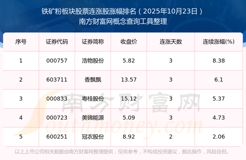 2025年10月23日鐵礦粉板塊股票連漲股漲幅排名