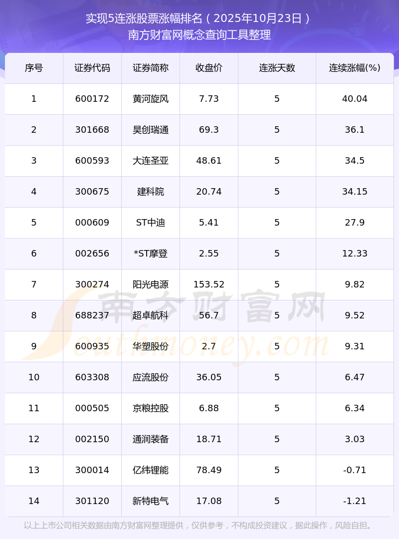 根據(jù)南方財富網(wǎng)概念查詢工具數(shù)據(jù)統(tǒng)計,截止2025年10月23日收盤,共有14只個股實現(xiàn)5天連漲。其中連續(xù)漲幅較大的個股有黃河旋風(fēng)、昊創(chuàng)瑞通、大連圣亞等,連續(xù)漲幅分別為40.04%、36.10%、34.50%。