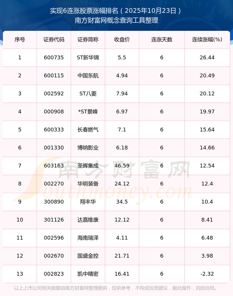 根據(jù)南方財富網(wǎng)概念查詢工具數(shù)據(jù)統(tǒng)計,截止2025年10月23日收盤,共有13只個股實現(xiàn)6天連漲。其中連續(xù)漲幅較大的個股有ST新華錦、中國東航、ST八菱等,連續(xù)漲幅分別為26.44%、20.49%、20.12%。