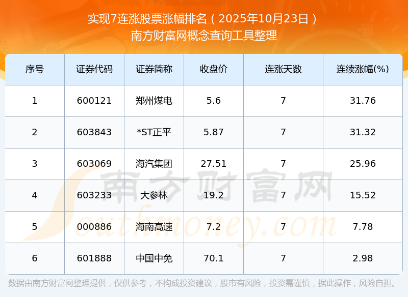 根據(jù)南方財(cái)富網(wǎng)概念查詢工具數(shù)據(jù)統(tǒng)計(jì),截止2025年10月23日收盤,共有6只個(gè)股實(shí)現(xiàn)7天連漲。其中連續(xù)漲幅較大的個(gè)股有鄭州煤電、*ST正平、海汽集團(tuán)等,連續(xù)漲幅分別為31.76%、31.32%、25.96%。