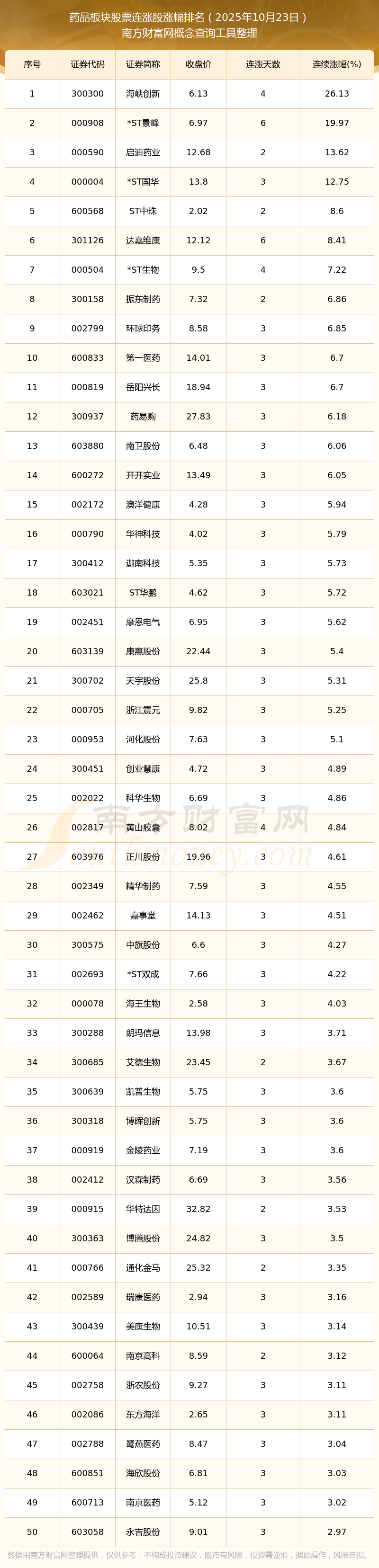 2025年10月23日藥品板塊股票連漲股漲幅排名
