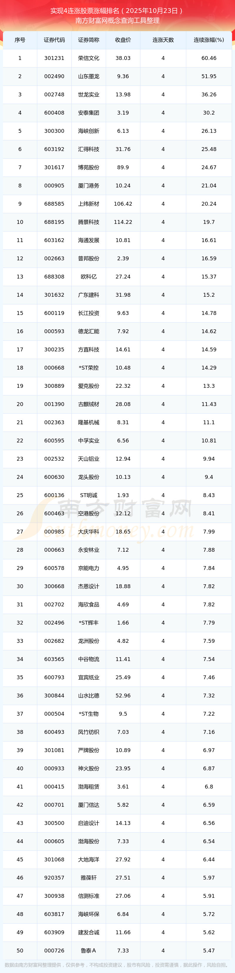 2025年10月23日實(shí)現(xiàn)4連漲股票漲幅排名